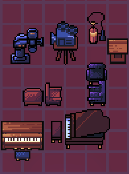 Items are decorative objects you can place in the cinema: plants, posters, tables, floor tiles, lamps, wall objects and more. Each item needs basic information, sprites for each rotation, collision settings, and an object type.