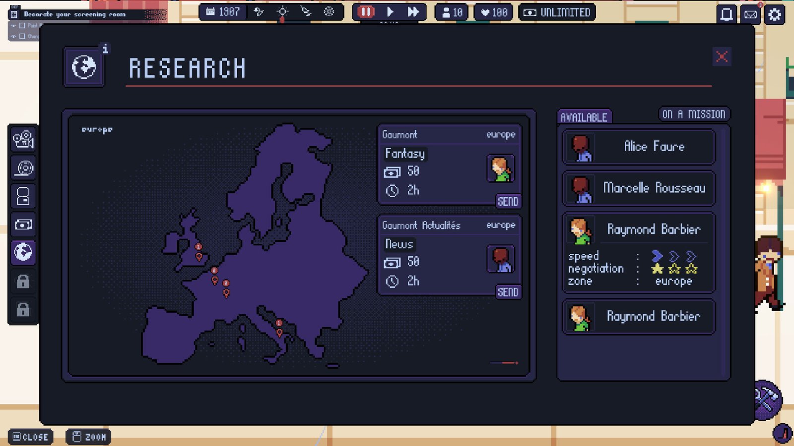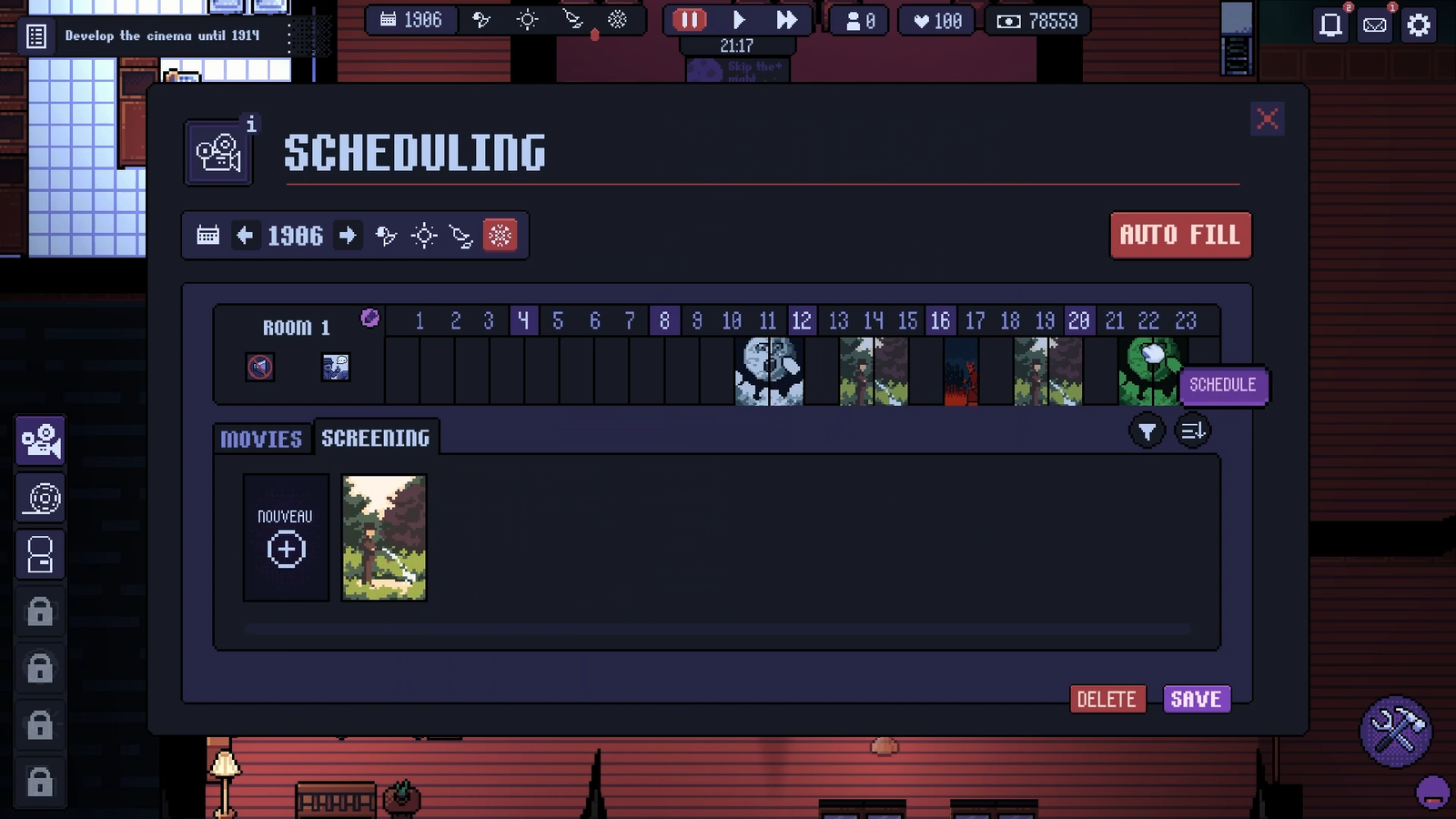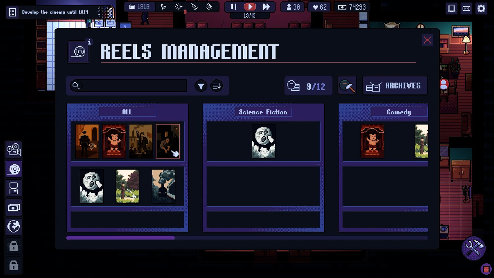 Manage and expand your cinema across over a century of film evolution! From the silent era to modern blockbusters, build your empire by customizing every aspect of your theaters, curating the perfect movie lineup, and overcoming the challenges of each era.